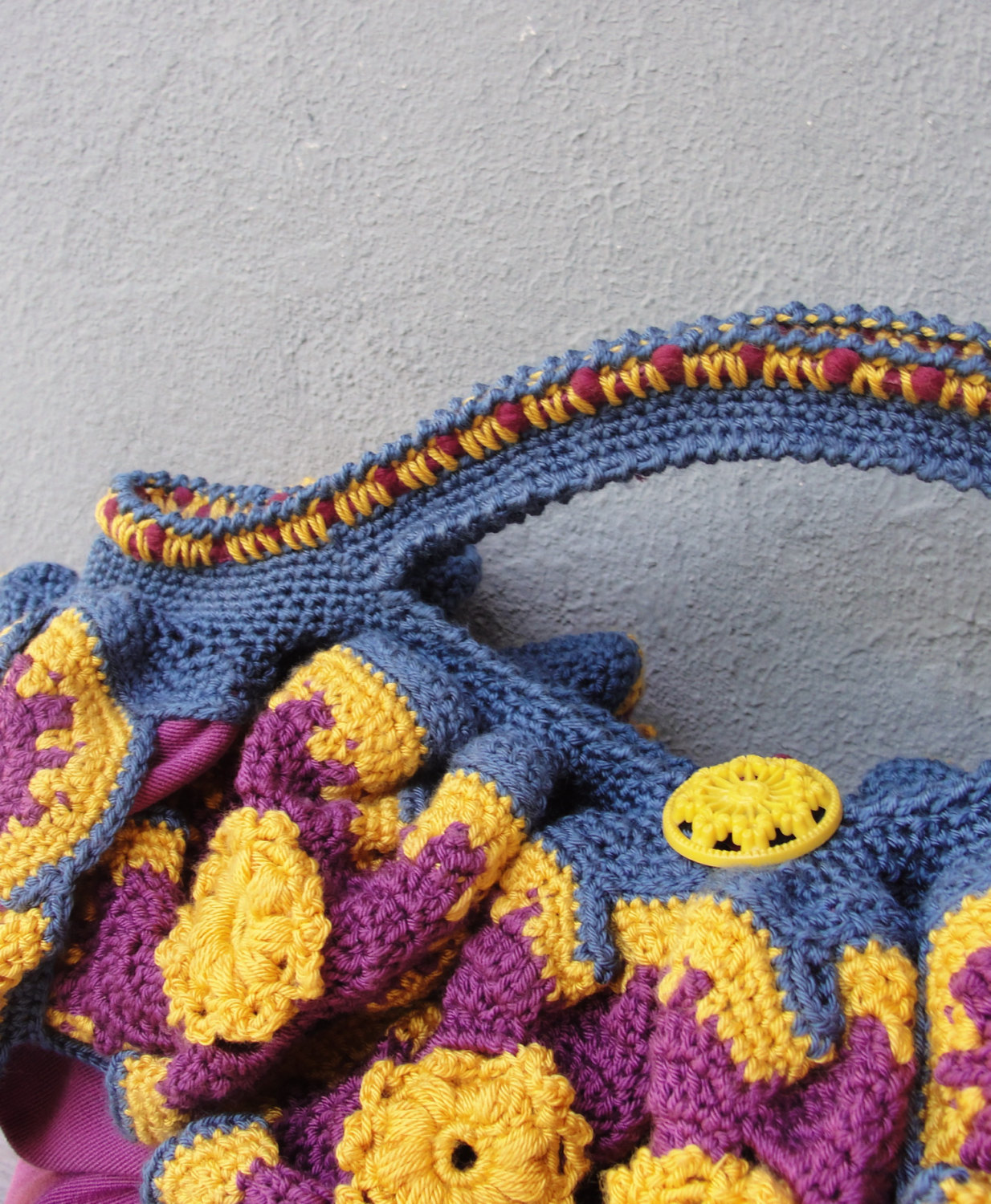 Bold, playful, and richly textured, this tote looks like a bouquet of sunbursts gathered on your arm. A smooth purple fabric base is covered in layered crochet motifs in mustard yellow and deep magenta, all edged in soft denim blue for a striking, sculptural effect.