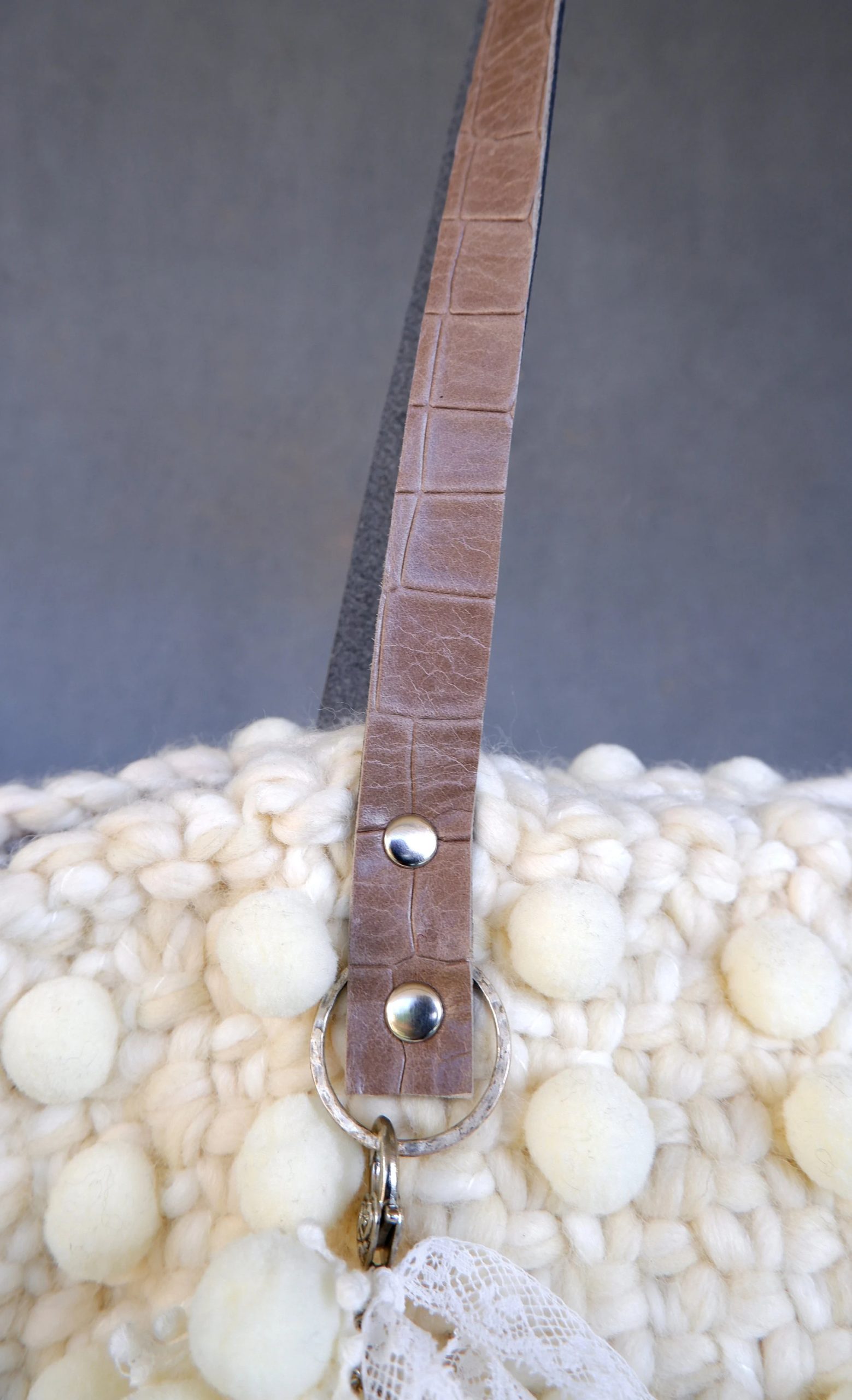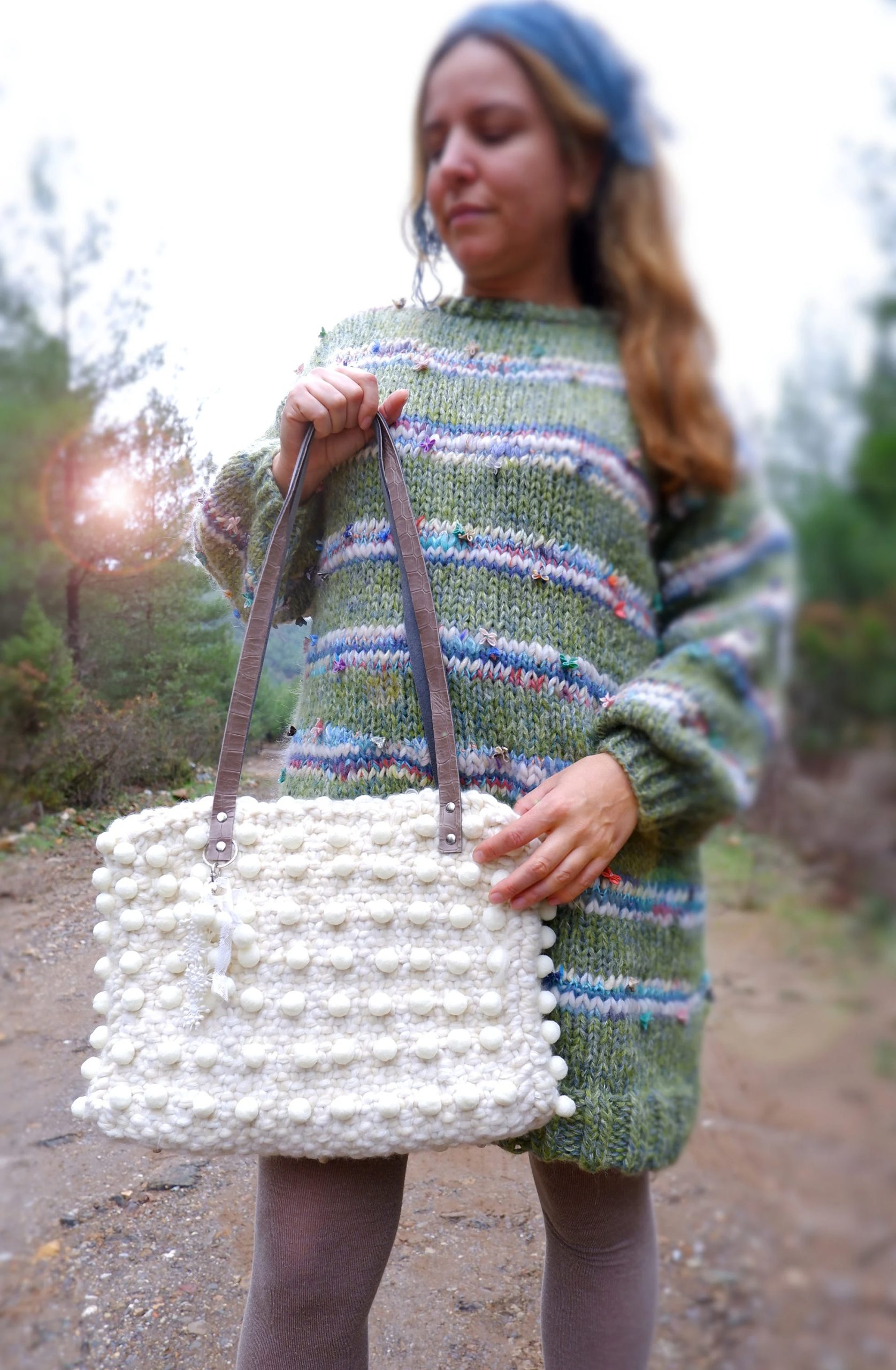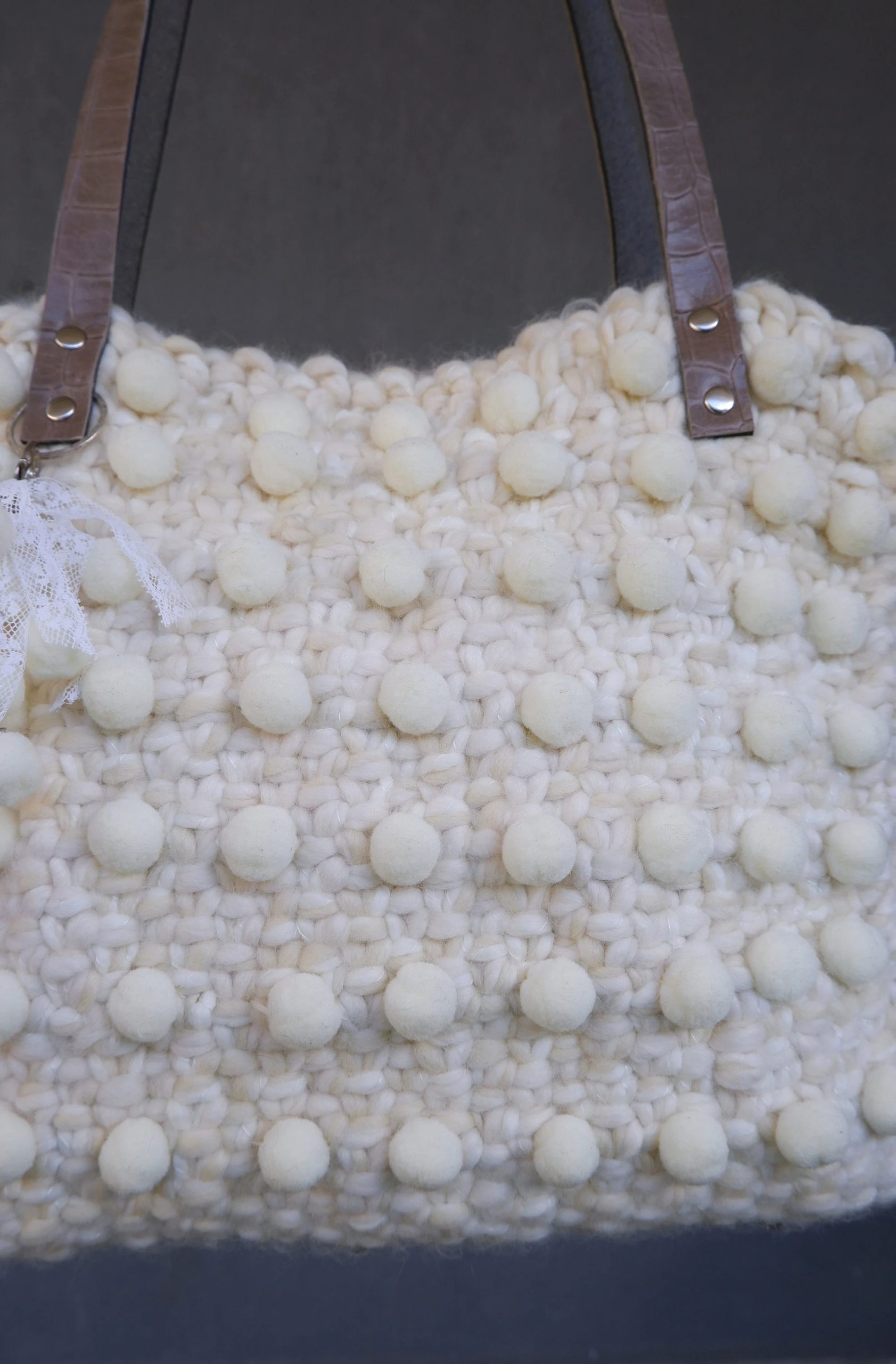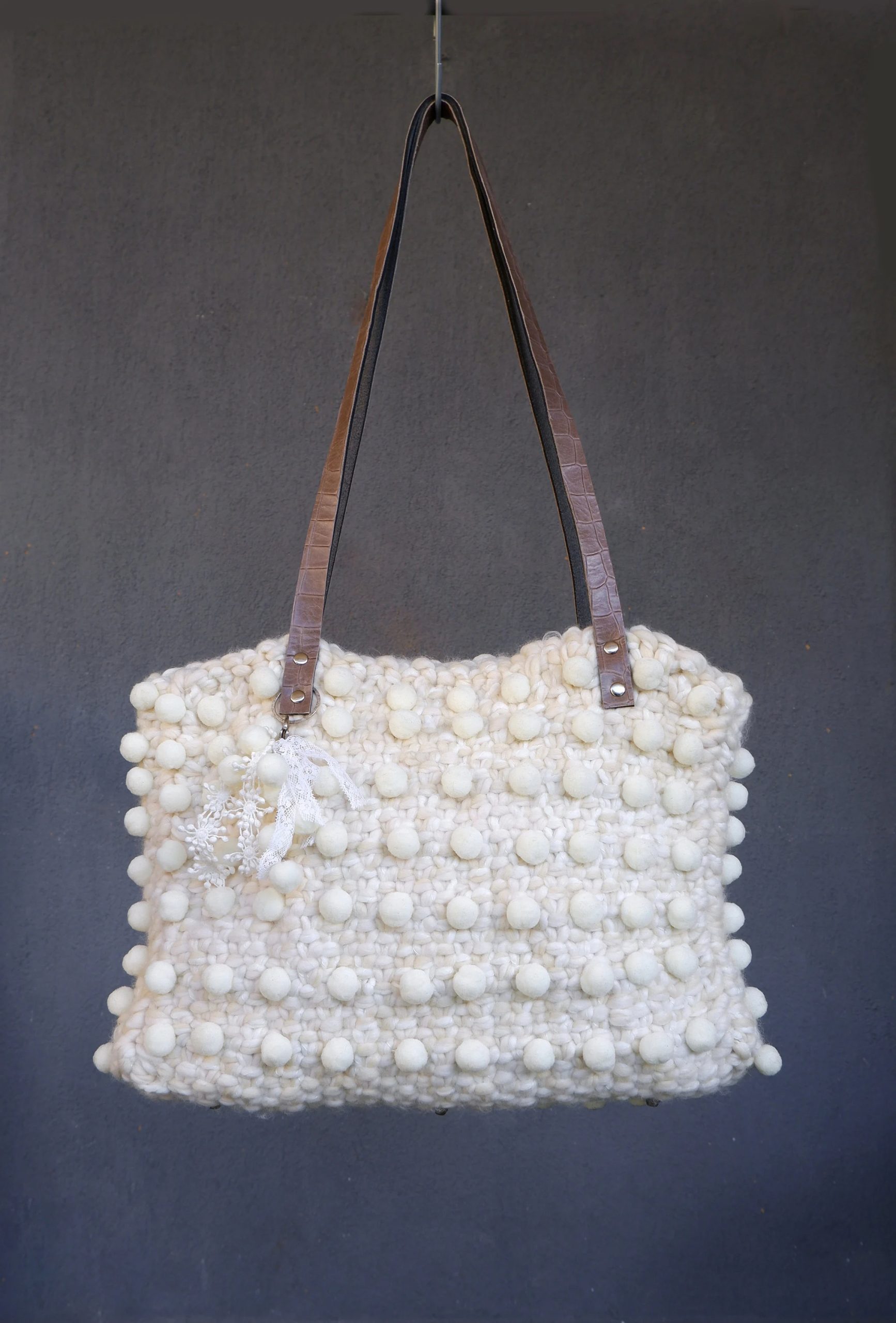 Soft, whimsical, and beautifully tactile, this tote looks like it’s been made from little clouds. The body is entirely covered in rows of plush white pom-poms and chunky woven texture, creating a dreamy, all-white statement piece that’s cozy yet chic.